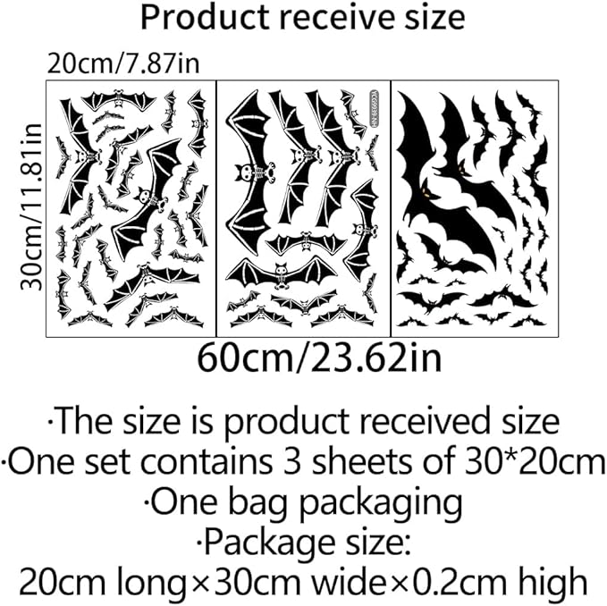 - Package Content: You will receive 3 Halloween glow-in-the-dark skeleton bat stickers, size 7.9*11.8inch, with different sizes and shapes of bats, sufficient quantity and various patterns to meet your Halloween decoration needs