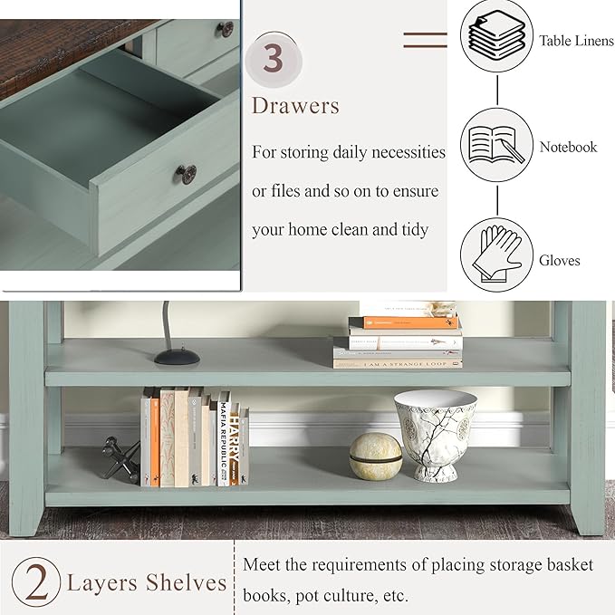 Solid Wood Console Table Sofa Table with Storage Drawers and Bottom Shelf Entryway Table for Entry Hallway Foyer Sofa Couch Table,Fully Assembled (48.8" Green)