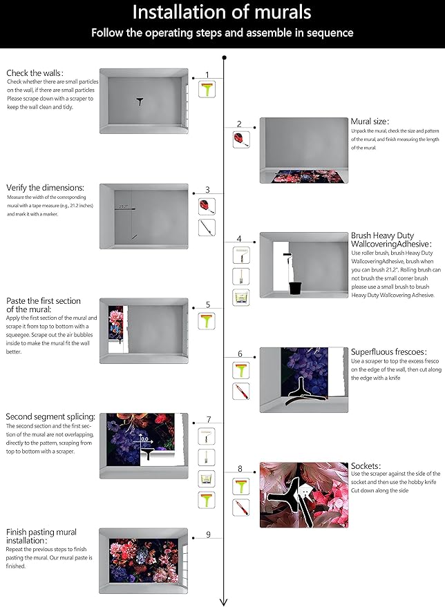 - Construction Installation: Each part of the mural is marked with a serial number underneath, no overlap, direct docking, in order. (Please refer to installation instructions)