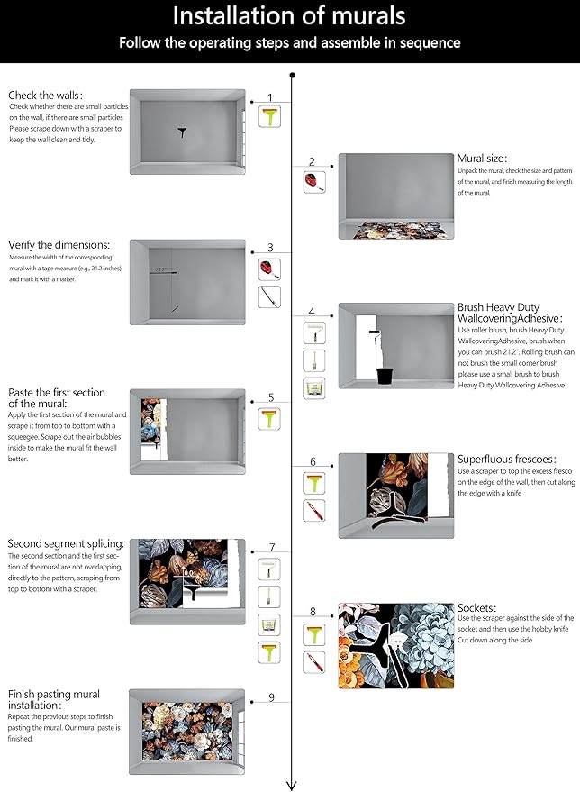 - Construction Installation: Each part of the mural is marked with a serial number underneath, no overlap, direct docking, in order. (Please refer to installation instructions)