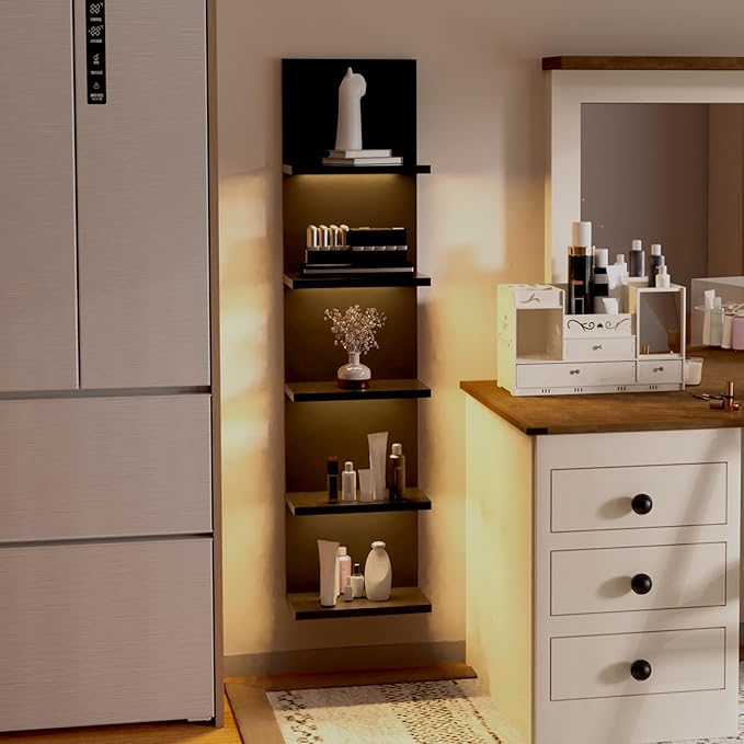 5 Tier Wall Shelf Unit, Black Modern Vertical Lack Wall Shelves with Light, Wall Mount, Floating Column Home Decor Shelves for Bedroom, Living Room, Vanity Storage Display