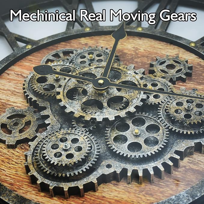 - 🧭【Unique Design, Only For Your Home】 Round solid Wood frame and classic retro skeleton with real mechanical moving gears in the central, the wooden frame is handcraft, showing unique attractive wood grain color and small natural knots; artificial rust-imitated treatment marks on the skeleton for vintage and industrial effect; stronger tempered glass resists any breakage and keeps safety whenever; The design is very different from other clocks, just to break the ordinary, only for your home.