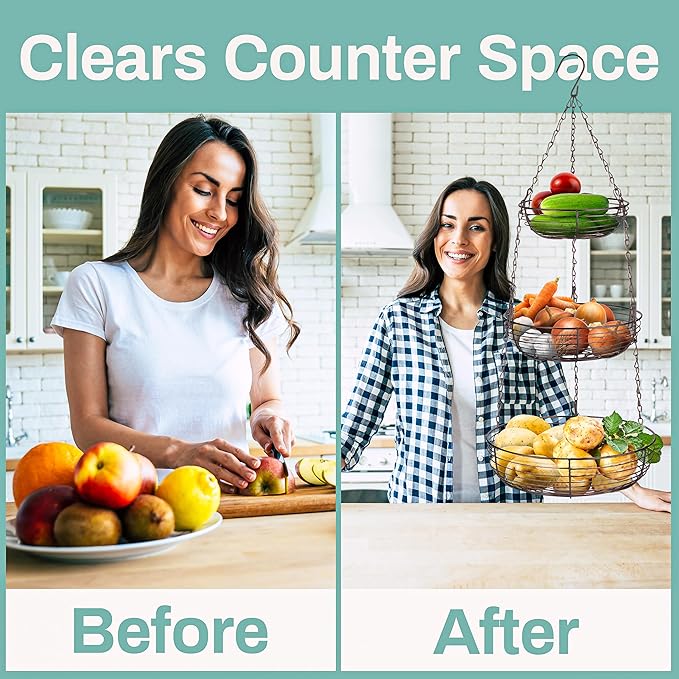 Home Intuition 3-Tier Hanging Fruit Produce Basket Heavy Duty Wire with 2 Metal Ceiling Hooks, Round, Bronze
