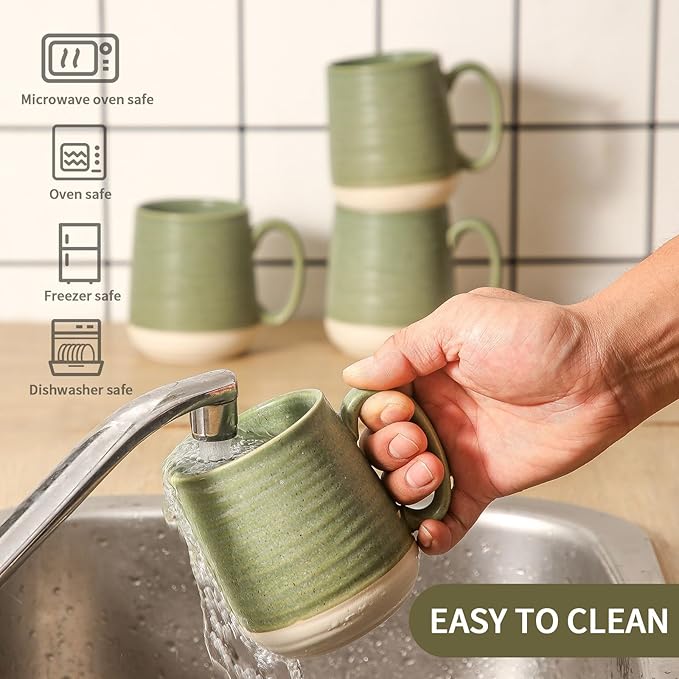 Large Ceramic Coffee Mugs Set - 15 OZ Porcelain Coffee Latte Cups Set of 4 with Handle Perfect for Cappuccino, Tea, Mocha, Hot or Cold Drinks, Unique Glaze Design for Home, Cafe and Coffee Bar, Green