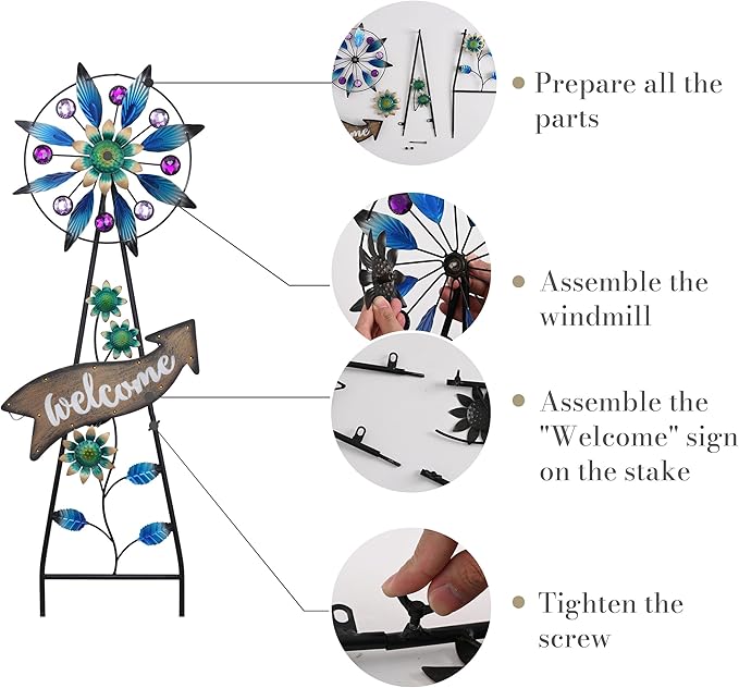 - 【Original Design】Featuring a stunning wind spinner in vibrant blue hues, embellished with sparkling purple gem accents, complemented by a rustic wooden "Welcome" sign and cascading floral accents, it adds an enchanting touch to any outdoor space.