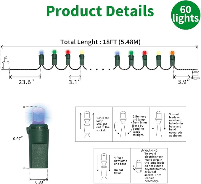 - 5mm LED Christmas Lights: 60 counts Multicolor 5mm wide angle stable LED string lights spaced 3.1 inches apart with green wire. 23.6 inch leads have a stackable male plug and 3.9 inch tails have a female plug for easy end to end connection.