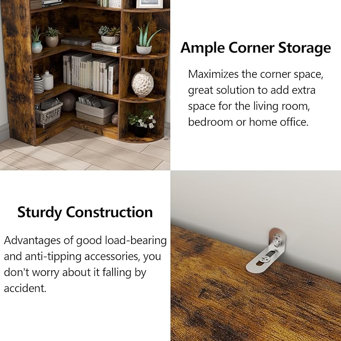 - 【High-caliber Quality & Sturdy Construction】This Loomie Rustic Corner Book Shelf is made from durable commercial grade laminate that will withstand all the daily stress that is thrown at it through the years, ensuring a consistent chic, minimalist look. Loomie Corner Book Shelf is a safe purchase when it comes to quality. Each shelf can hold up to 80 lbs. Anti-tipping kits, reinforced hardwares and full baffle improve the stability and security. You don't worry about it falling by accident. Overall, it will get the storage or display job done and look good doing it. It's a perfect size bookshelf for every home corner space.