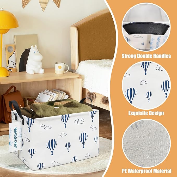 LANGYASHAN Rectangular Storage Bin Collapse Canvas Fabric Cartoon Storage Basket with Handles for Organizing Home Kitchen Boys and Girls Toys Office Closet Shelf Baskets (Rec Blue Balloon)
