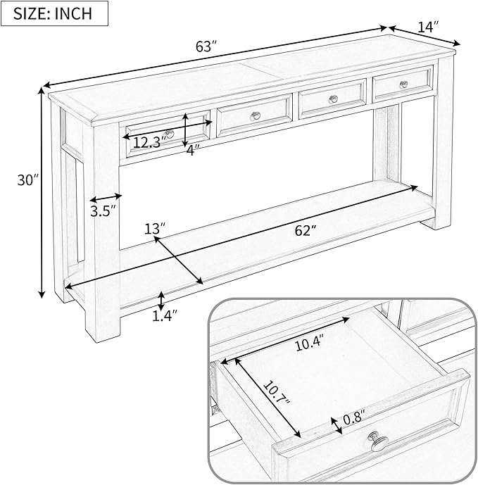 - 🌳【Long Console Table】The console table 63''L x 14''W x 30''H .Solid Wood Sideboard Console Table features a retro design that adds a touch of vintage charm to your living room, kitchen, or dining room. Its classic aesthetic enhances the overall ambiance of your space