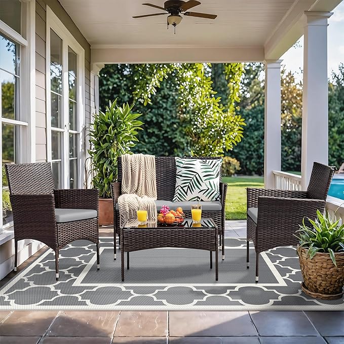 GENIMO 6' x 9' Outdoor Rug Waterproof for Patio Decor, Foldable Reversible Plastic Straw Area Rugs Mat for Camper, Outside Carpet for Rv, Deck, Porch, Picnic, Beach, Balcony, Grey & Beige White