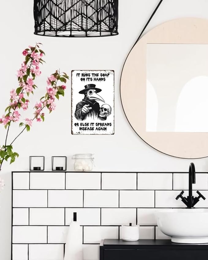 ALKB Halloween Bathroom Decor 8 x 12 Inch - Goth Plague Doctor Metal Tin Sign,Gothic Lovers Gifts,IT RUBS THE SOAP ON ITS HANDS