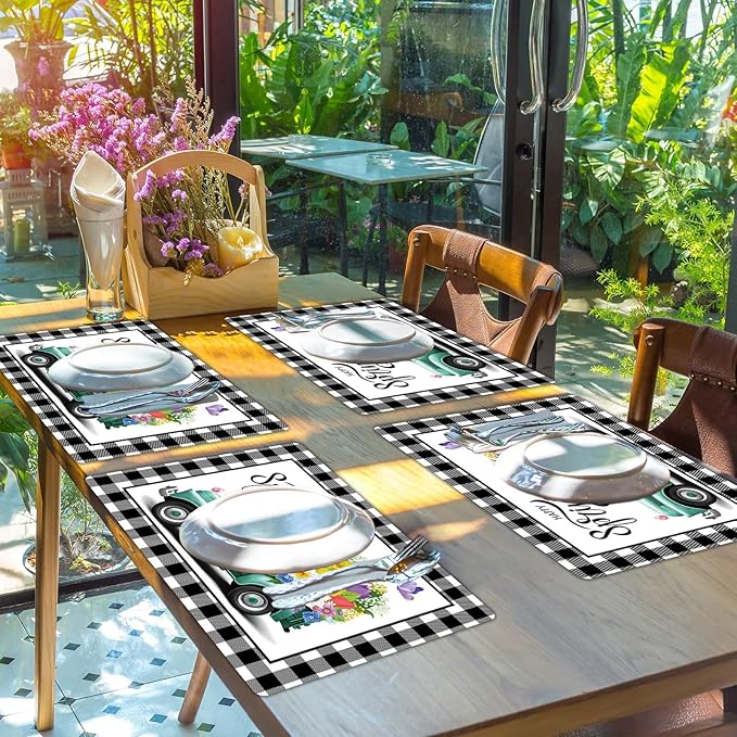 - Eye-catching design:The design of the seasonal spring placemats incorporates classic elements of truck with flowers,which will create a cheerful atmosphere for your spring party.
