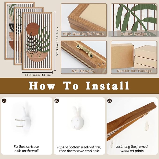 IARTTOP Large Boho Wood Wall Art Framed 16x32 Inch Mid century Modern Wooden Wall Decor Abstract Bohemian Minimalist Art Decor for Bedroom Living Room Office Set of 3