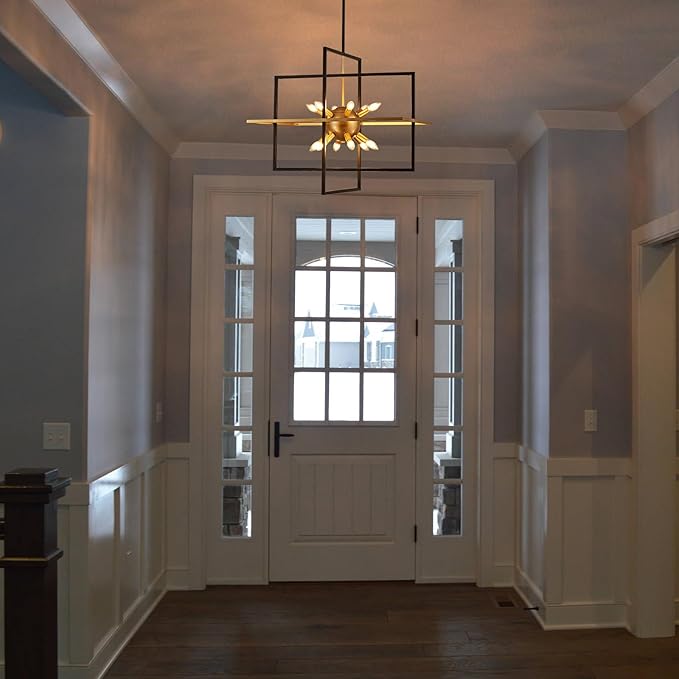 - 【Large-Scale Frame Design】The stunning combination of modern and industrial elements brings an unprecedented sense of style to your space with this awe-inspiring cubic geometric pendant light. The center of the artificial satellite chandelier features 12 golden lights surrounded by two layers of rectangular metal frames. It's perfect for living rooms, kitchen islands, dining rooms, hallways, staircases, entrances, coffee shops, and restaurants.