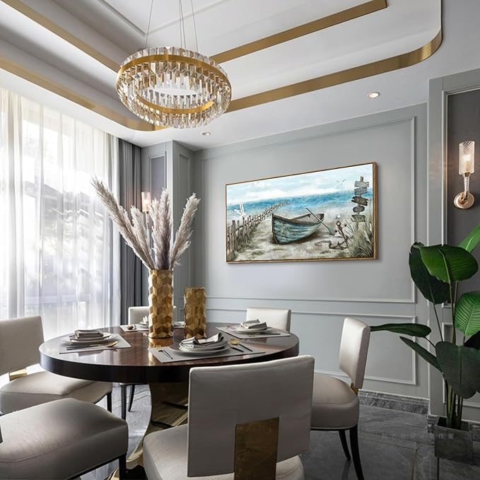 - Calming Seashore Aesthetic: This serene large framed wall art captures sea bird resting on the rowboat. Behind the boat is blue ocean with the soaring seagulls. The nautical palette of blues, sand beige, tan, and fluffy white clouds provide a soothing feel. Hang this beach themed framed wall art up for a calming vibe, and escape to the beach each day after work in the comfort of your home.