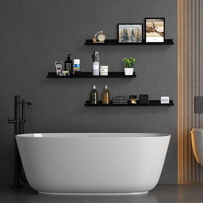 - [Safe Design, Adds Style to Home Decor]: The combination of pine wood and black finish gives this bathroom wall shelves a modern minimalist style aesthetic that perfectly matches any style of furniture and decor.Designed with a front ledge, each shelf effectively protect items from falling off.