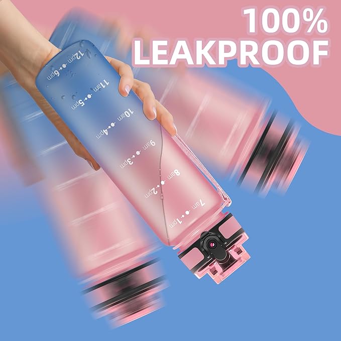 OLDLEY 32 oz Water Bottle, Motivational Water Bottle with Time Marker, Sports Water Bottle With Strap, Leakproof & BPA Free Large Water Bottles for School, Gym, Travel, Outdoor, Tritan,Pink&Blue