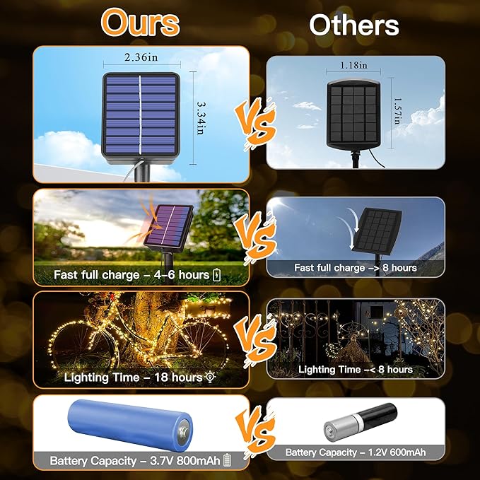 - 【Fast Charging Long Lasting】The outdoor string lights equipped with an 800mAh rechargeable battery that can be quickly fully charged within 6 hours. Once charged, the lights can shine for about 18 hours. The lights are also equipped with a built-in sensor that automatically turns them on at dusk and off at dawn, making them more efficient and convenient to use