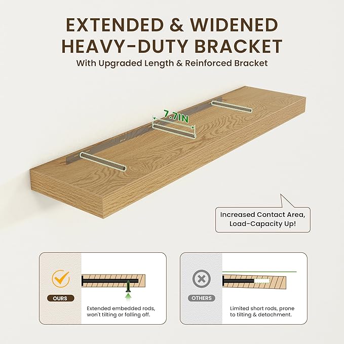 - DEEPER & THICKER SHELF- Our floating shelves measure 48W x 11.6D x 2H, deeper and thicker than usual wall shelves, which create more storage and display space for your home