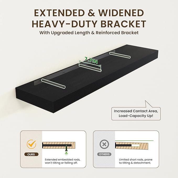 - DEEPER & THICKER SHELF- Our floating shelves measure 48W x 11.6D x 2H, deeper and thicker than usual wall shelves, which create more storage and display space for your home