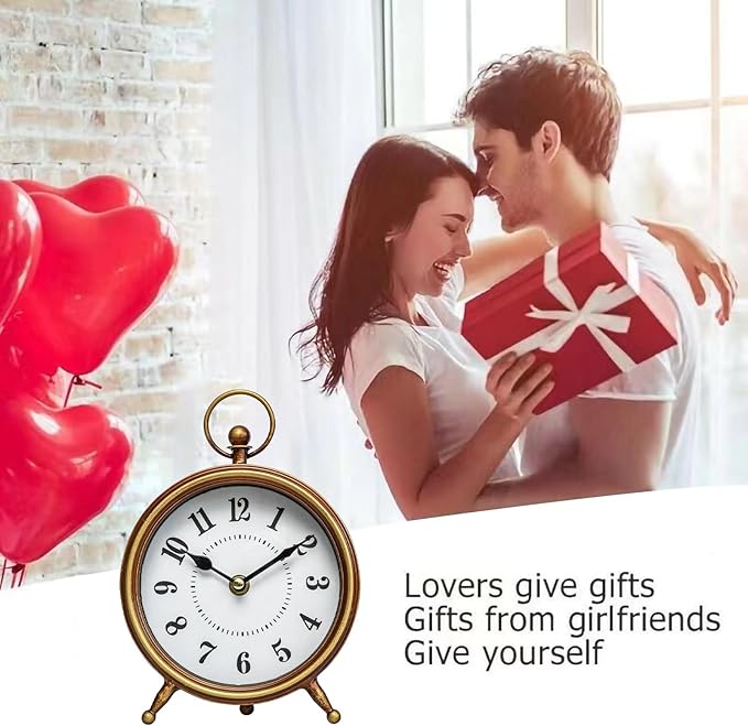 Vintage Small Table Clock on Stand, Decorative Desk and Shelf Clock Farmhouse Mantel Non-Ticking Clock Rustic Metal Frame with Antique Gold Finish 9.3 Inch