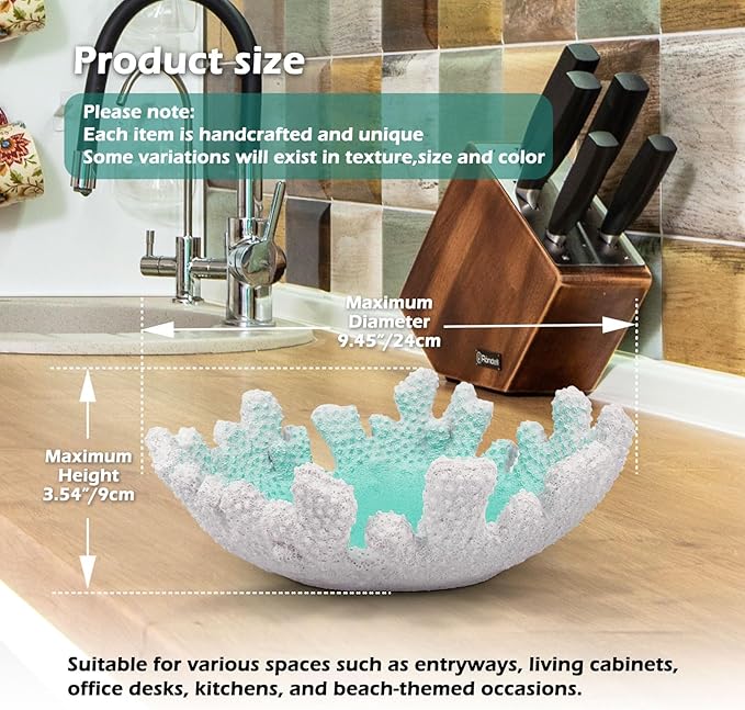 - [Beach coral decorations for home] This Turquoise coral decorative bowl is inspired by the serenity and allure of coastal living. With soothing hues and natural textures, it brings effortless beach charm to any home. Experience the feeling of being on a perpetual vacation at the seaside, all without exploiting our precious oceans. This coral decorative bowl perfect for modern coastal bowl decor and coastal decor for home