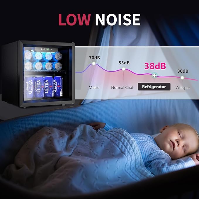 - 【PORTABLE DESIGN】The beverage fridge is compact and takes up very little space, so it can be placed on the bedside, counter or wall corner, the mini fridge glass door has a 1.3cuft capacity and can hold up to 48 cans of beer