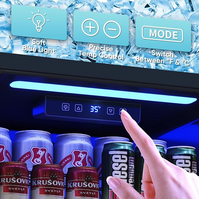 - [Simple & Intelligent Control System] Our Beverage Refrigerator features a user-friendly touch panel that allows for easy temperature adjustment. With a temperature range of 35-65°F (2-18°C), you can easily customize the temperature to your liking (55°F is often cited as close to perfect). To accommodate your usage preferences, we have also added a MODE button. This allows you to toggle between Fahrenheit and Celsius temperatures.There's also an LED light that comes on at the touch of a button.