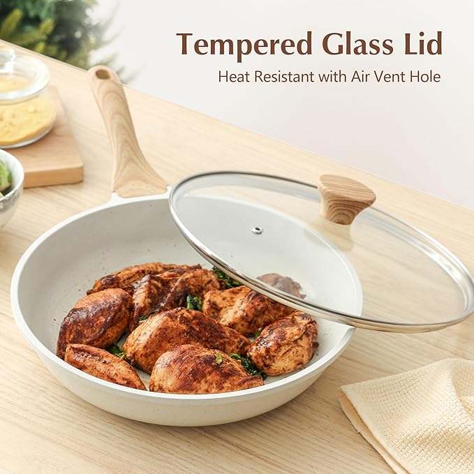 - HEAT RESISTANT HANDLE AND TEMPERED GLASS LID - The bakelite handle of the ceramic non toxic frying pan with lid features woodgrain design, and it is comfortable to grip and stays cool while cooking. The tempered glass lid can prevent the oil from splashing onto your stovetop.