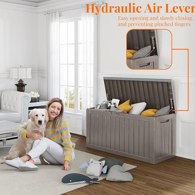 - VERSATILE IN EVERY SETTING: This patio storage box doubles as an indoor laundry organizer and an outdoor yard storage unit for cushions, garden tools, pool accessories, outdoor gear, and more, offering ample space. It can also serve as a side table, patio seat, storage bench, or footstool
