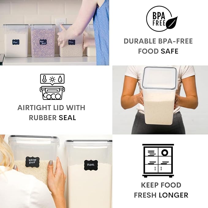 - ๐๐๐-๐ ๐ซ๐๐ ๐๐ฎ๐ฅ๐ค ๐๐ญ๐จ๐ซ๐๐ ๐: Our food storage containers with lids come in 2 extra-large (6.5 L / 220 oz - 11.1 x 7.2 x 7.2 inches) and 2 large (5.2 L / 175 oz - 8.9 x 7.2 x 7.2 inches) sizes, perfect for safely storing rice, pasta, and lentils. It also comes with 4 measuring cups for added convenience. These BPA-free food storage containers with lids keep essentials of kitchen storage containers fresh and neatly organized for longer use. Ideal as rice container and sugar container options.