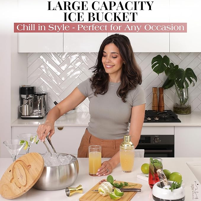 - QUALITY THAT MATTERS Stainless steel large insulated ice bucket with wooden lid and tong crafted for durability and optimal insulation, BPA-free ice bucket for bar with comfortable and ergonomic design that makes it perfect for parties and gatherings