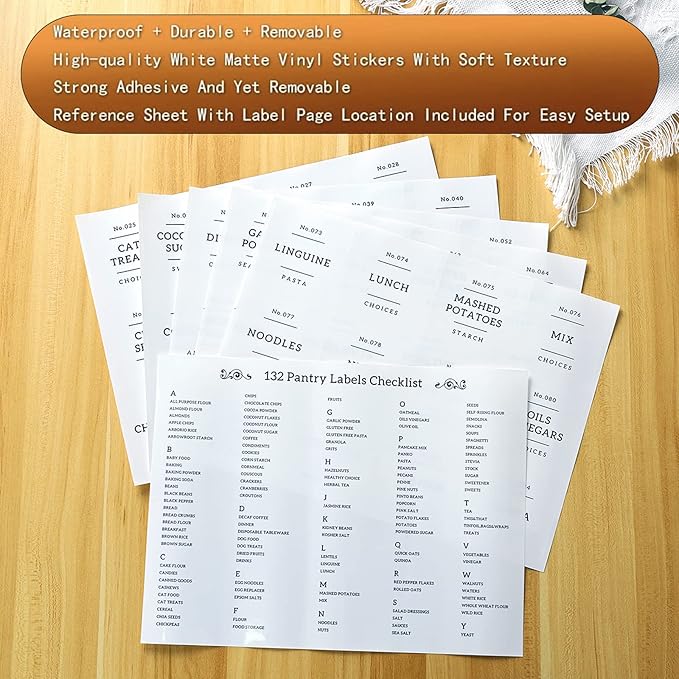 - 132 - KITCHEN FOOD LABEL STICKER: We prepared 132 pre-printed kitchen food white label stickers, which allow you to easily distinguish between flour and bread flour, salt and sugar, pasta and gluten-free pasta, etc. This sticker is waterproof, you can rinse the bottle with water and the sticker will not fall off.