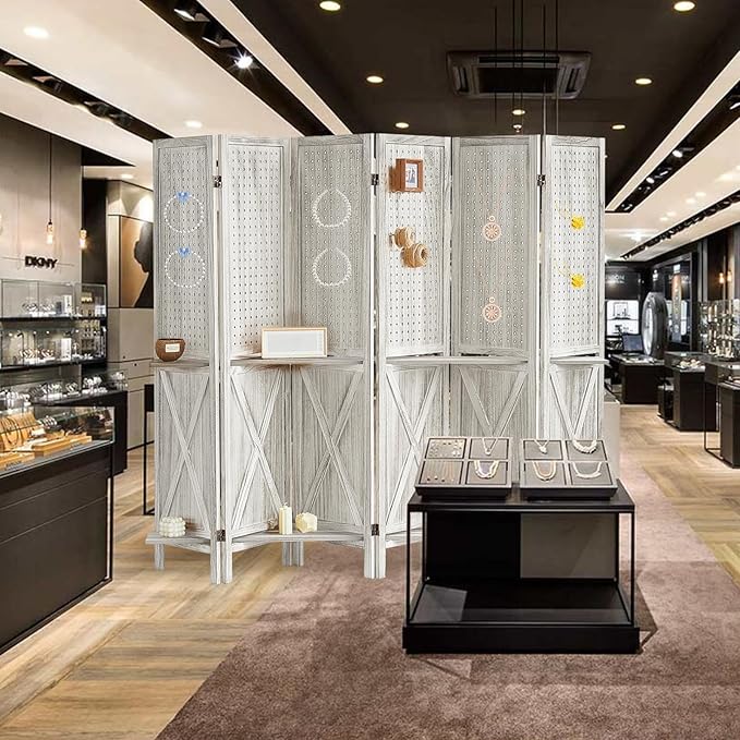 6 Panel Pegboard Display with 24 Hooks, Wooden Pegboard Room Divider Wall with Shelf, Rustic Room Dividers and Folding Privacy Screens, Bedroom, Jewelry Store, White