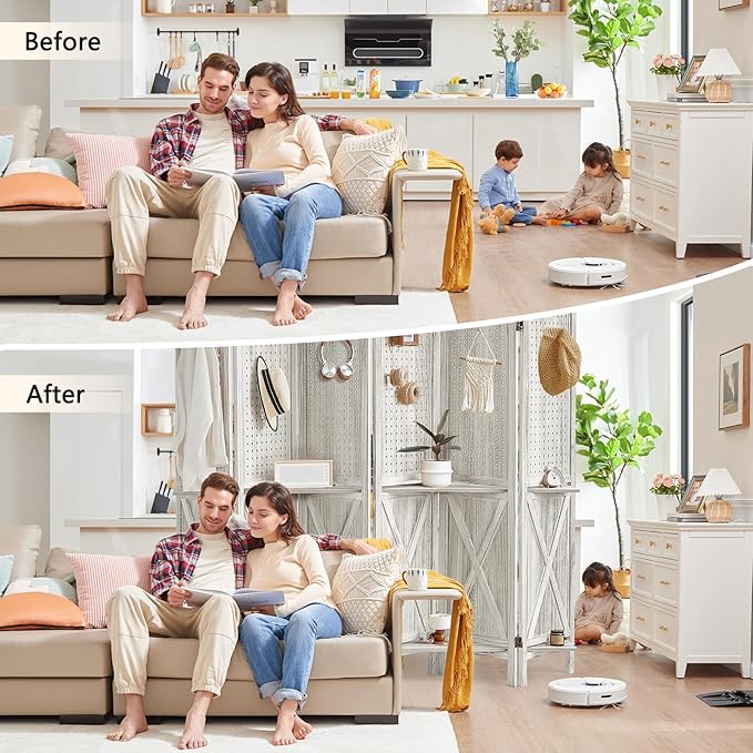 - Double Shelves Design - The exquisite double shelf design, skillfully integrated into the room divider, not only enhances the sense of hierarchy of the space, but also gives it practicality. The upper level can display your favorite artwork, photos or books, while the lower level can be used for plants, small ornaments or daily necessities, denying space clutter. Pegboard room divider design takes into account both display and storage needs, making your living space both beautiful and organized