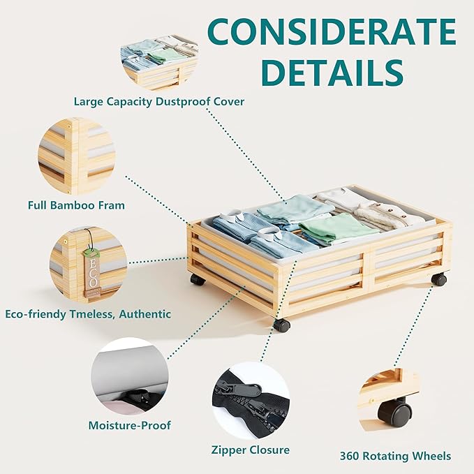 - 👍[Sturdy and Durable] Our under bed storage with wheels is crafted from premium wood bamboo, boasting 4 rotating wheels and a capacity of 120lbs. This 'under bed storage' solution includes non-woven bags for efficient organization of clothes, books, shoes, and toys.