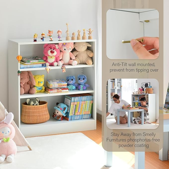 - Bookcase with Adjustable Shelves:3 tier bookcases white with 2 flexible shelves,which can be removed or adjusted to suit the needs of storing large-sized items.Freestanding utility cabinet with a lot of storage space for home office storage in living room/kitchen/study room/bathroom and more.