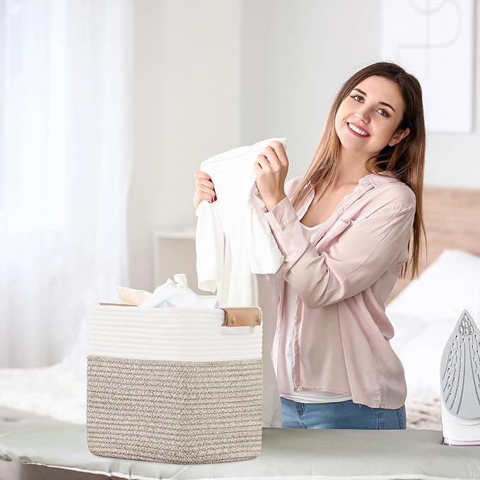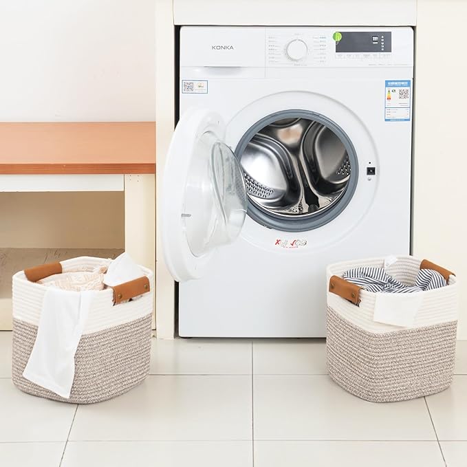 - Modern Charm: The leather handles of storage baskets for shelves provide comfortable grip for easy carrying. Woven storage bins are made of 100% cotton to ensure long lasting use. The contrast between them creates a stylish and modern look