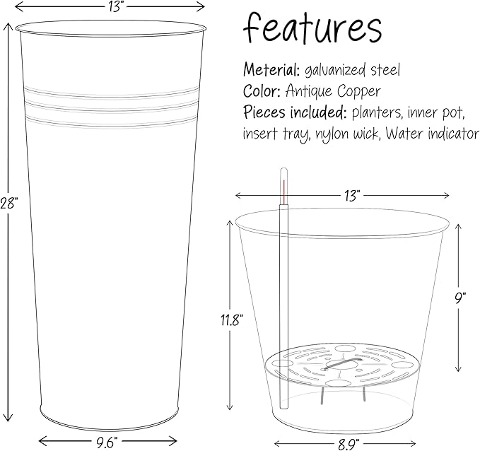 KOL 28'' Tall Galvanized Steel Planter Pot - Flower Pot with Water Level Indicator for Plants - 2 Pack Self Watering Planters - Round Bronze Powder Metal Planter Box - Indoor Outdoor Grande Plant
