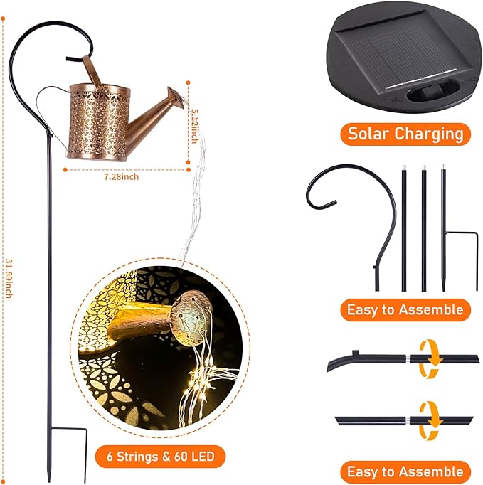 - Tool-Free Solar Watering Can Light: Installs in just 3 minutes with 3 simple steps: 1. Attach handle & hook 2. Insert into lawn 3. Hang the light. No wiring or external power needed.