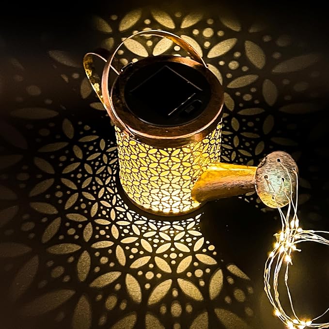 - Creative Garden LED Light: This solar watering can light features a unique hollow watering can design with flexible LED string lights that can be bent to your liking. Perfect for hanging on porches, pergolas, or placing on tables and windowsills, it adds a cozy glow to your yard and patio. When lit, the twinkling lights mimic water sprinkling from the can, creating a magical garden ambiance!