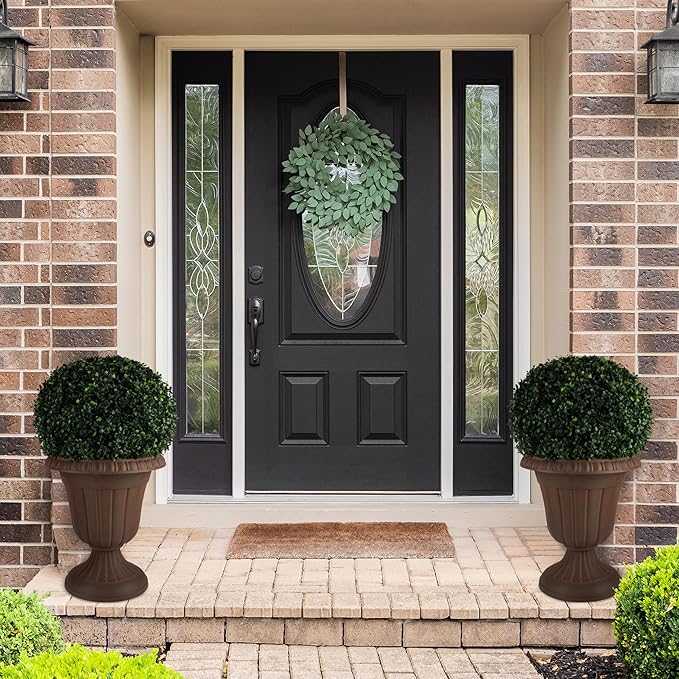 - PRODUCT DETAILS - Materials: Recycled Polypropylene Plastic. Dimensions: (L) 16” x (W) 16” x (H) 18”; Weight: 3.8lbs; Interior Planting Space: 13” Diameter x (H) 12.75”; Soil Capacity: 30lbs/13.6L. Front Door Planters Outdoor Set of 2. Color: Brown.