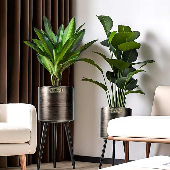 Harvest Land Plant Pots with Stand, Set of 2 Large Modern Planters Metal Tall Handmade Flower Pots with Drainage Holes Indoor Outdoor,Black