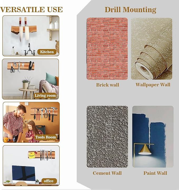 - 【Multi-purpose】The kitchen knife magnetic holder can be used as a knife bar, knife strip, knife holder, kitchen utensil holder, home storage rack, art storage rack and tool holder. It is an ideal magnetic holder for kitchens, utility rooms, laundry rooms, garages, etc. Use it to safely store knives, scissors, cutlery, thereby freeing up more kitchen space, and all your knives will be visible and within reach, thus keeping the edges and blades of knives sharper and preventing them from getting damaged in drawers.
