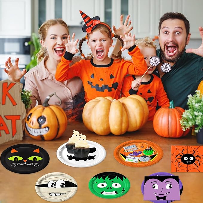 - HALLOWEEN DESIGNS: This Halloween party supplies series is themed around cute Halloween elements. The Halloween plates and cups feature designs with pumpkins, black cats, ghosts, and spiders, creating a delightful Halloween party ambiance for you.