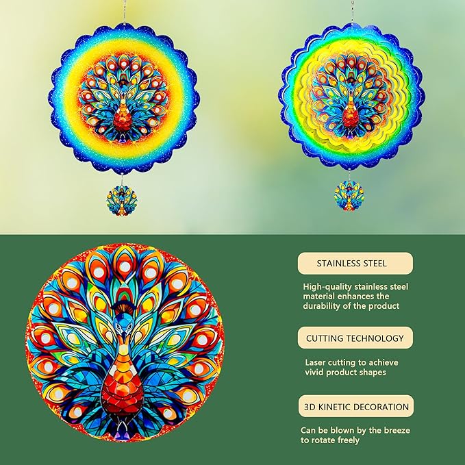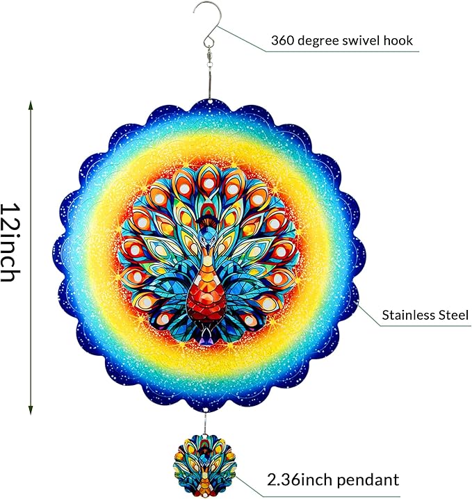 - 【Product introduction】: This 3D wind spinner is made of 12 inches and made of high-quality stainless steel. which adopts cutting technology and PUV printing to achieve a vivid peacock shape.