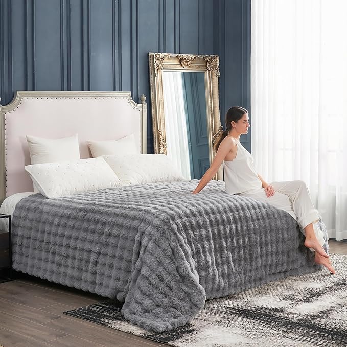 Cozy Bliss Faux Fur Throw Blanket for Couch, Fuzzy Soft Plush Thick Bubble Blanket for Sofa Bedroom Living Room, 108 * 90 Inches Light Grey