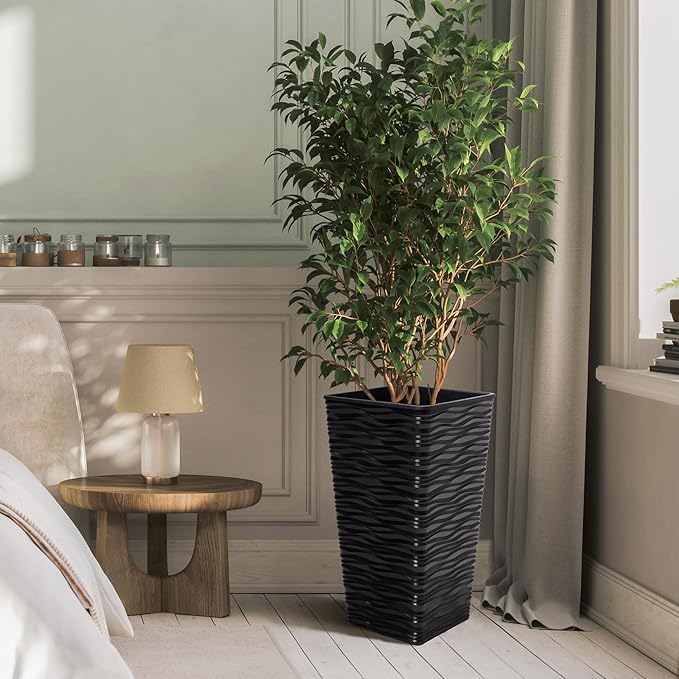 - Stylish Design: These 22" H. black square tapered planters feature a modern wavy finish for an elegant decorative touch