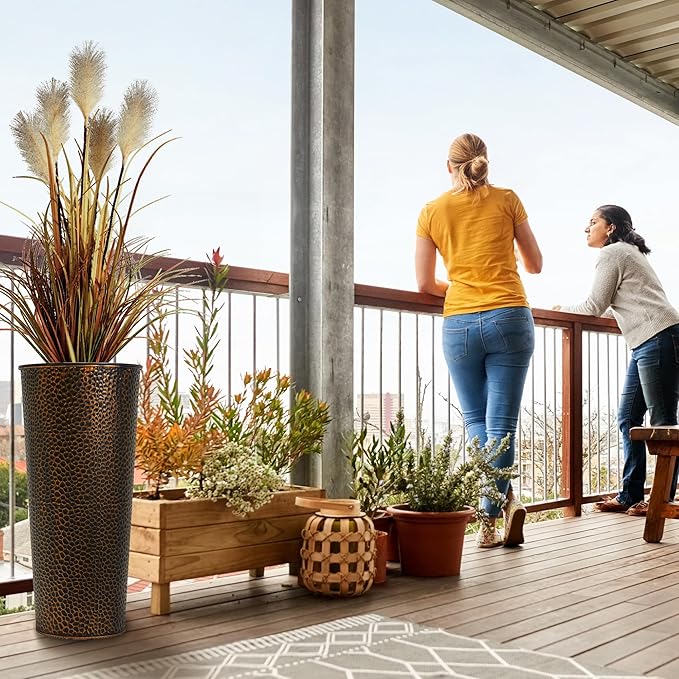 Worth Garden 2-Pack 25" H. Metal Planter with 2X Inside Pots - Hand-Hammered Texture Tall Cone Plant Pots - Large Handcrafted Black Flower Pot for Indoor Outdoor, Deck, Patio, Front Porch (Bronze)