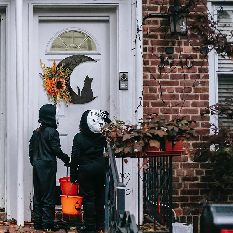 - Halloween Wreath Decorations: 2025 moon cat black halloween wreaths for front door adopts classic black cat, moon, rattan and roses Halloween elements! "Look, there's a kitten standing up and trying to touch the moon"! Very fun, create a mysterious and scary Halloween atmosphere for your home
